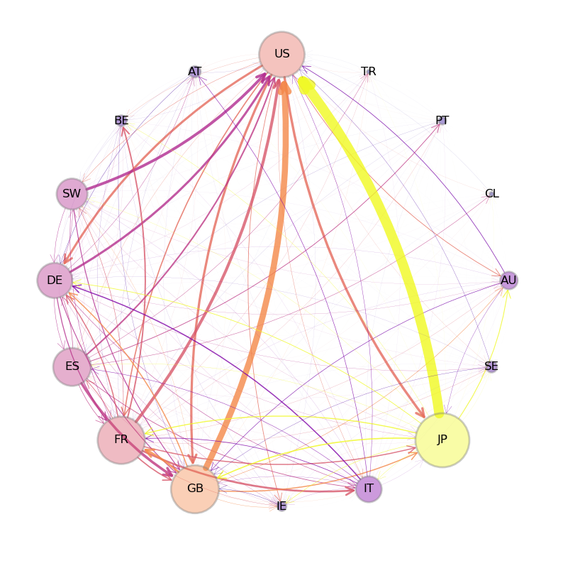 The following figure shows international trade in large commercial aircraft in 2019 based on International Trade Data SITC Revision 2.