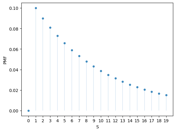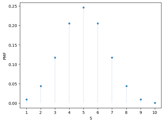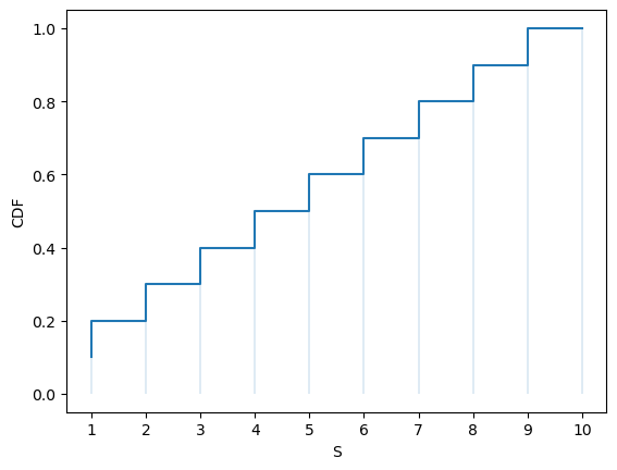 A discrete distribution is defined by a set of numbers S={x1,,xn} and a probability mass function (PMF) on S, which is a function p from S to [0,1] with the property