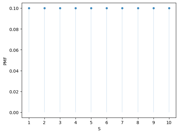 We can import the uniform distribution on S={1,,n} from SciPy like so:
