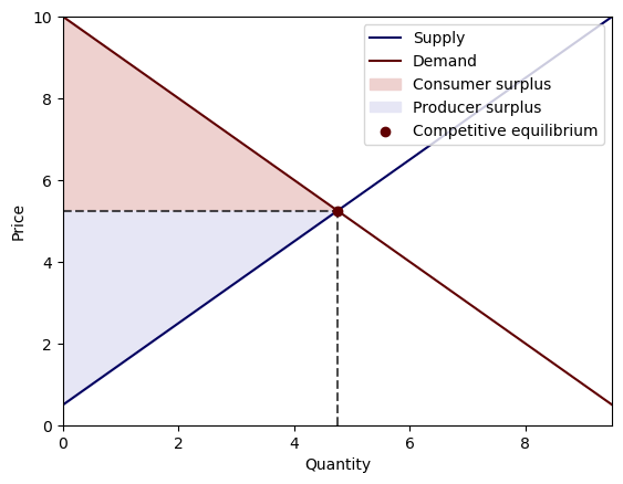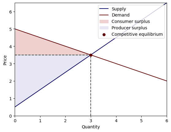Define a function that plots the demand, marginal cost and marginal revenue curves with surpluses and equilibrium labelled.